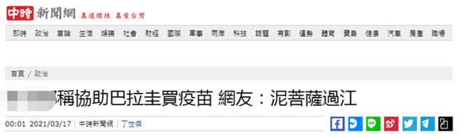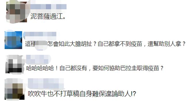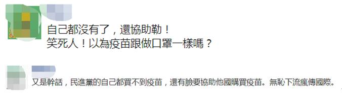 还有网友批评民进党当局,“泥菩萨过江(自身难保)。”“自己都拿不到疫苗,还帮助别人?”↓
