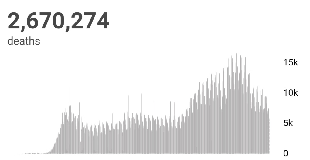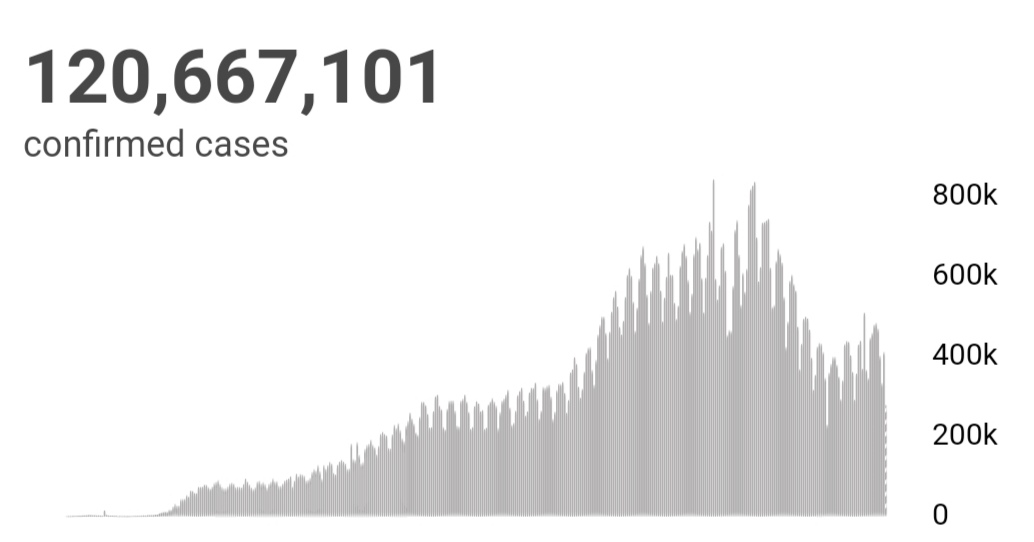 全球累计新冠确诊病例120667101例,累计死亡2670274例