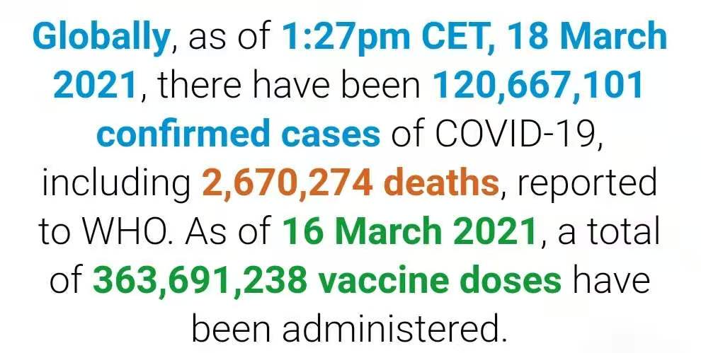 根据世卫组织最新实时统计数据,截至欧洲中部时间3月18日13时27分(北京时间3月18日20时27分),全球累计新冠肺炎确诊病例120667101例,累计死亡病例2670274例。