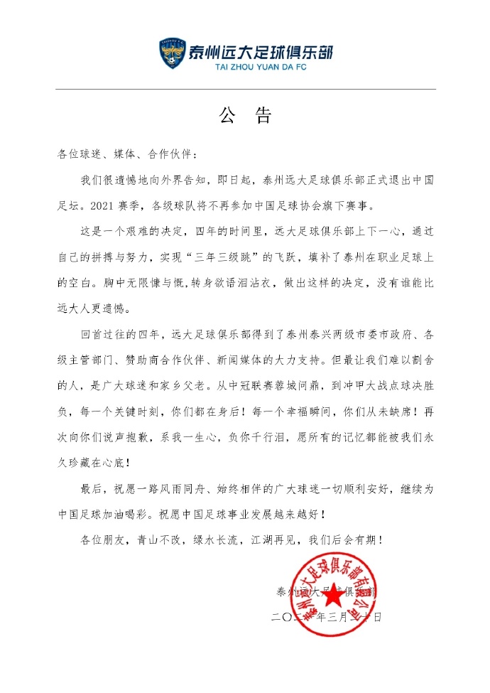 泰州在公告中表示“这是一个艰难的决定”,非常遗憾做出这个决定,最让俱乐部难以割舍和要说声抱歉的是广大球迷和家乡父老,同时也祝愿中国足球事业发展越来越好。