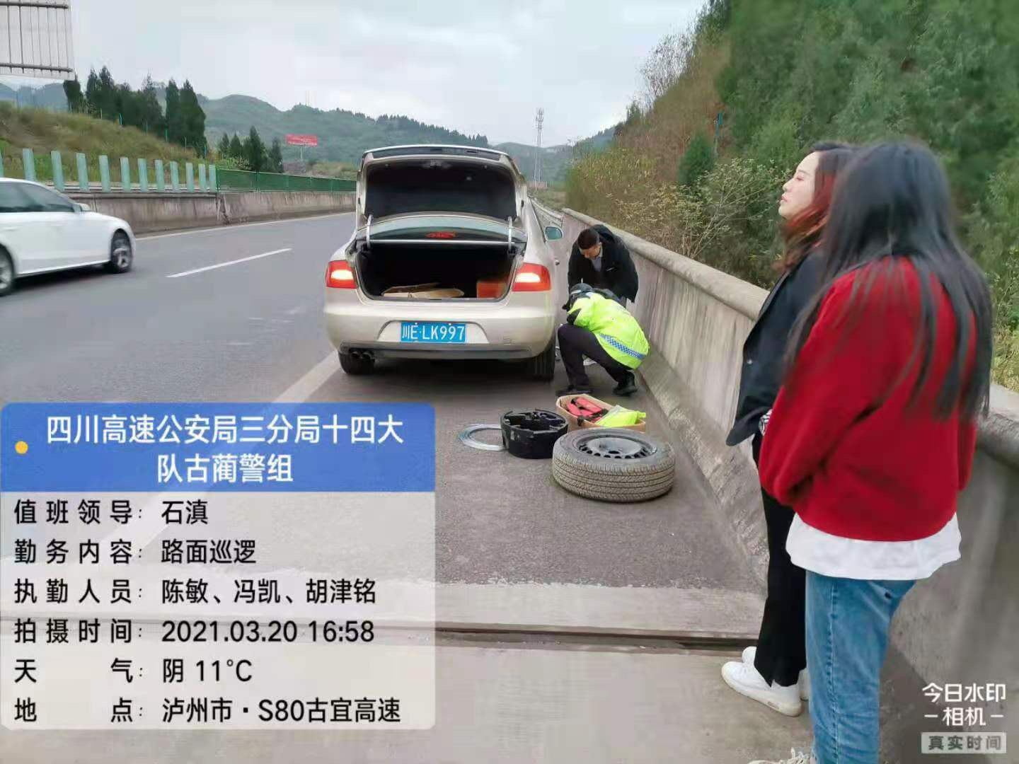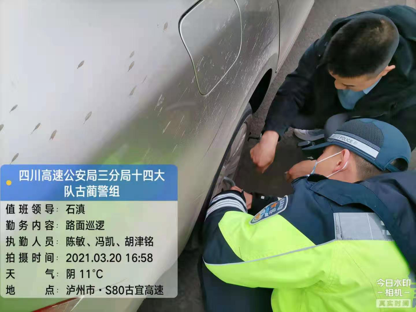 3月20日17时03分许,四川省公安厅高速公路公安局三分局十四大队民警陈敏和辅警胡津铭驾驶警车巡逻到古宜高速习古方向26公里时,发现一辆轿车打着双闪停在应急车道上,一名男子手足无措地在车旁边徘徊。民警立即将警车停在轿车后方,在做好安全防护后上前询问驾驶人情况。得知该车因爆胎无法继续前行,虽然车上有备胎,但驾车男子竟然不会换胎。