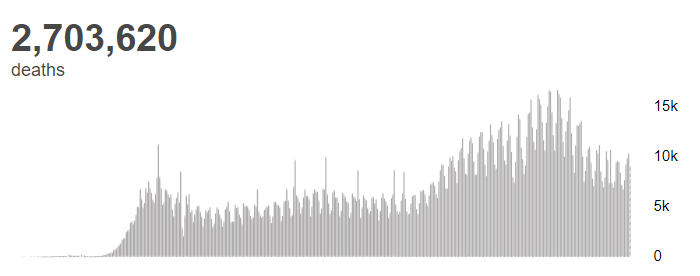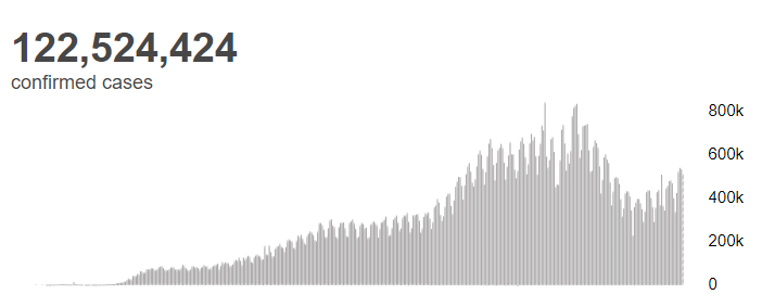 根据世卫组织最新实时统计数据,截至欧洲中部时间3月21日14时27分(北京时间3月21日21时27分),全球累计新冠肺炎确诊病例122524424例,累计死亡病例2703620例。21日全球新冠肺炎确诊病例新增513797例,死亡病例新增9084例。