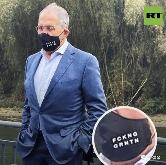 俄罗斯人心情很放松。在另一张照片中,拉夫罗夫还戴着一个特制款黑口罩,据说是记者送的生日礼物,口罩上面印有两个英文单词:FCKNG QRNTN。