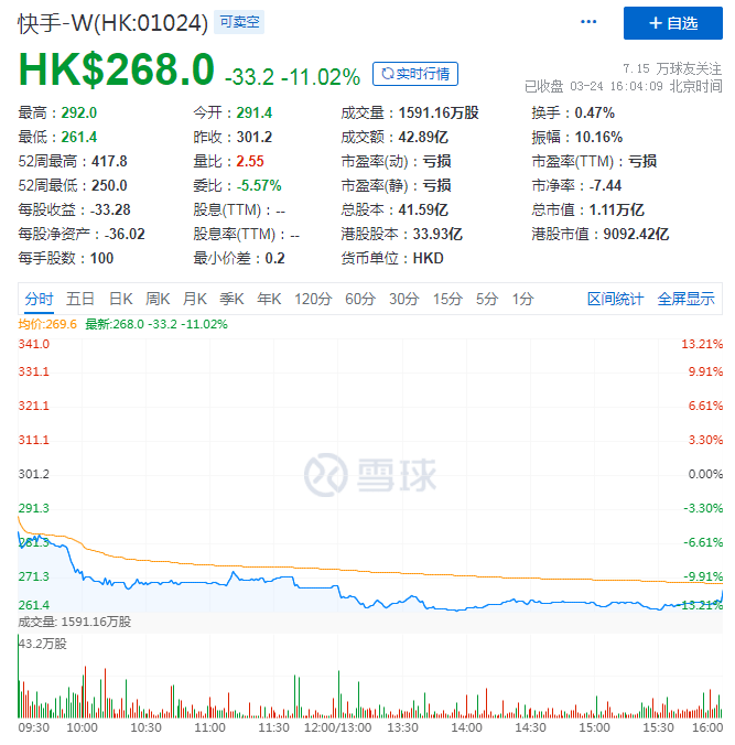 财报发出后,快手股价走势一直处于低迷状态。3月23日港股开盘,快手一度跌幅近17%,截止当日港股收盘,快手跌幅11.02%。