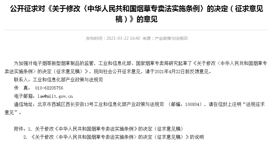 3月22日,工信部网站发布通知,对修改《烟草专卖法实施条例》公开征求意见。在此次条例修改中,将在附则中增加一条关于电子烟的政策。