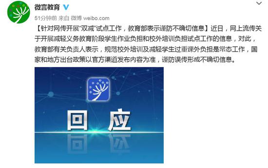 中新经纬客户端3月27日电 据教育部官方微博“微言教育”消息,针对网传开展“双减”试点工作,教育部表示谨防不确切信息。