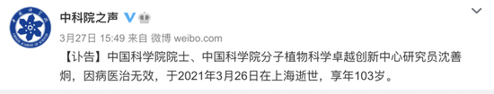 中国科学院院士、中国科学院分子植物科学卓越创新中心研究员沈善炯,因病医治无效,于2021年3月26日在上海逝世,享年103岁。