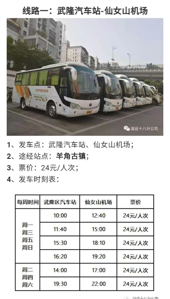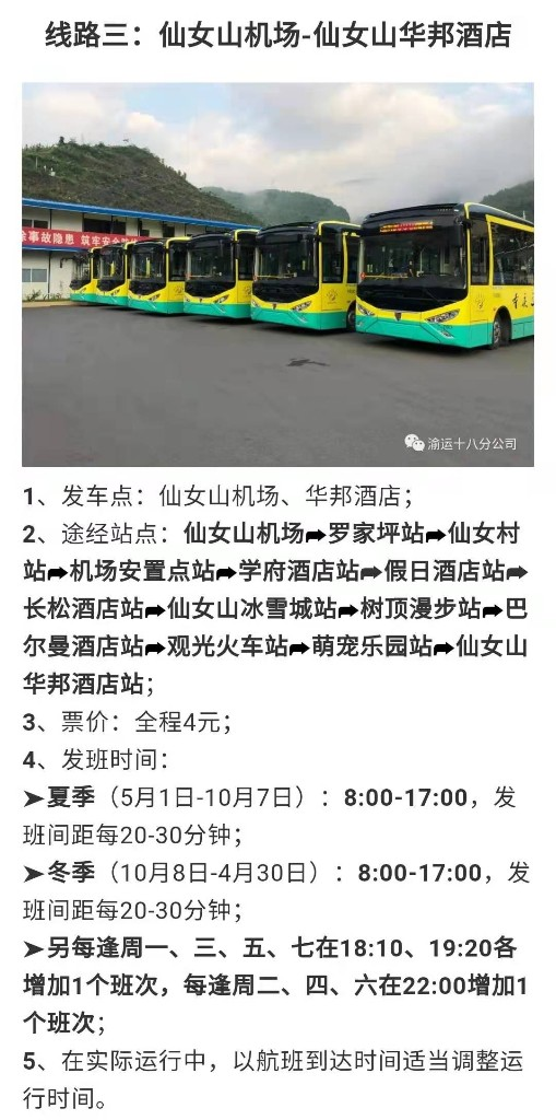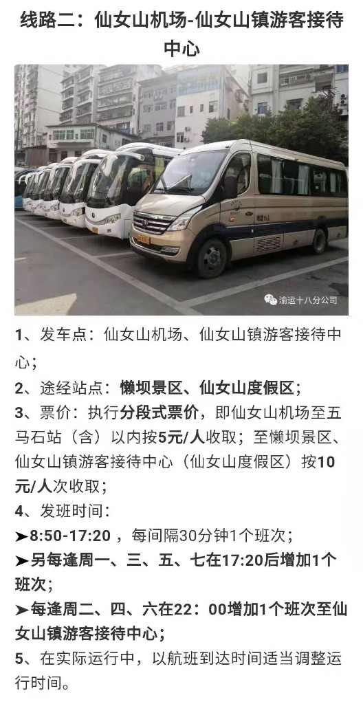 据悉,为方便旅客出行,武隆区从28日起开通仙女山机场至武隆城区汽车站、度假区游客接待中心、仙女山华邦酒店三条班车线路,沿途可上下站至各相关景区景点。