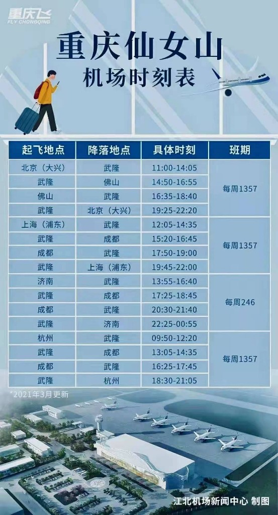 据渝武机场公司负责人介绍,28日当天,杭州-武隆-成都、北京-武隆-佛山、上海-武隆-成都三条航线航班先后降落仙女山机场,从仙女山机场共起飞6个班次航班至北京、上海、杭州、成都、佛山五个城市。3月30日,济南-武隆-成都航线亦将正式开航,后续将陆续开通至重庆、西安、合肥、贵阳、温州、长沙等地的航线。