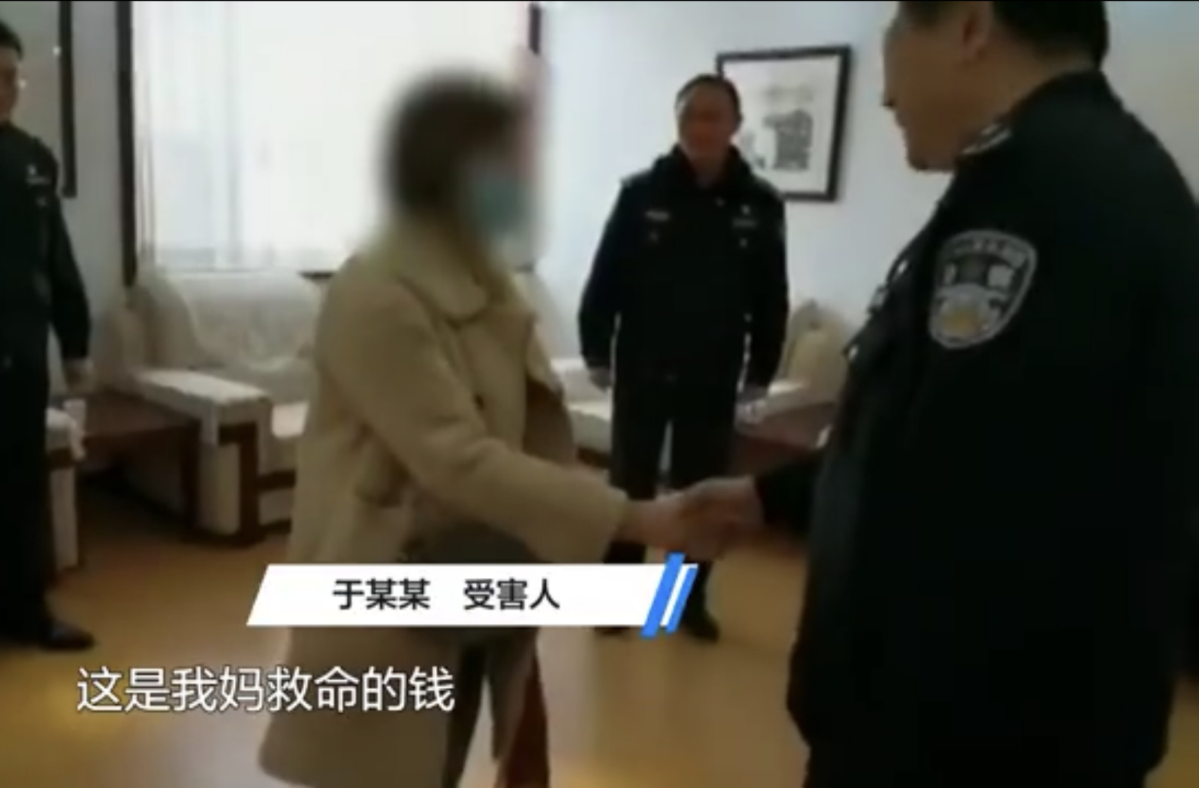 失主感谢民警为她找回这笔救命钱,和警方握手,还送了一个锦旗表达感谢。
