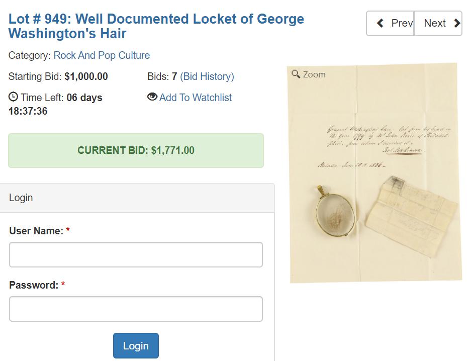 据美国《国会山报》26日消息,美国利兰拍卖行正在拍卖美国首任总统乔治•华盛顿的一缕头发,起拍价1千美元。报道形容称,装有华盛顿数根头发的手工黄铜玻璃瓶还附有一封手写信,信中写道:华盛顿将军的头发来自于费城的约翰•皮尔里先生(Mr.JohnPierie),他于1799年从他(华盛顿)头上剪下来,而我是从皮尔里那里收集到的。