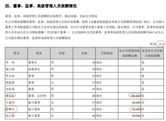 3月26日消息,皖能电力(000543)今日发布的2020年年报出错,在《董事、监事、高级管理人员报酬情况》栏,将薪酬单位误写成万元,致使公司全体高管薪酬高达361亿元。