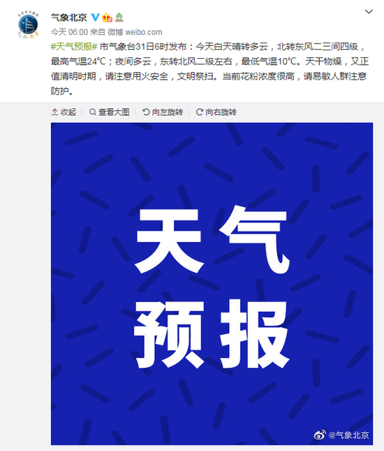 市气象台31日6时发布:今天白天晴转多云,北转东风二三间四级,最高气温24℃;夜间多云,东转北风二级左右,最低气温10℃。天干物燥,又正值清明时期,请注意用火安全,文明祭扫。当前花粉浓度很高,请易敏人群注意防护。