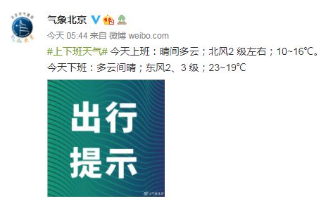 今天上班:晴间多云;北风2 级左右;10~16℃。
