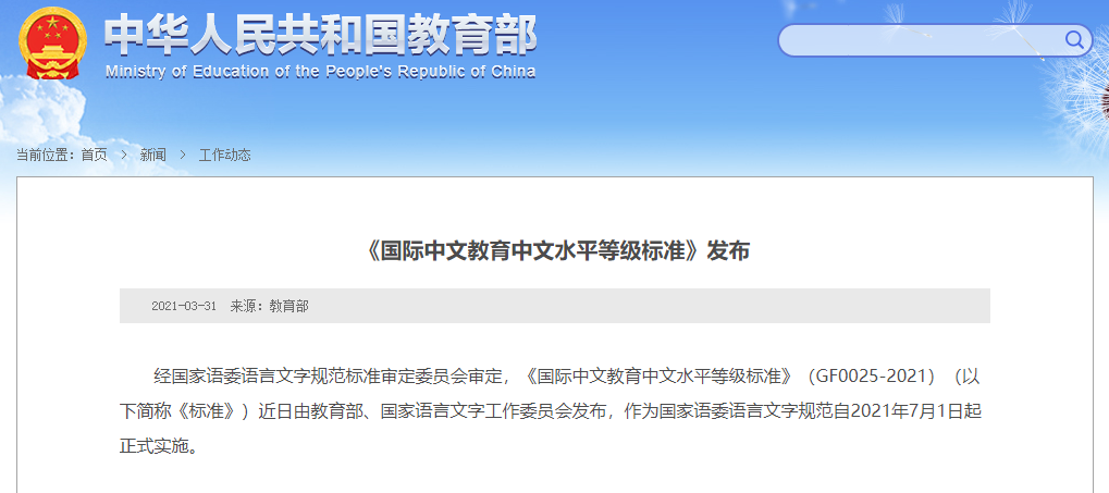3月31日,教育部发布了《国际中文教育中文水平等级标准》,将学习者中文水平分为“三等九级”,这也是国家语委首个面向外国中文学习者,全面描绘评价学习者中文语言技能和水平的规范标准,该标准将于2021年7月1日起正式实施。