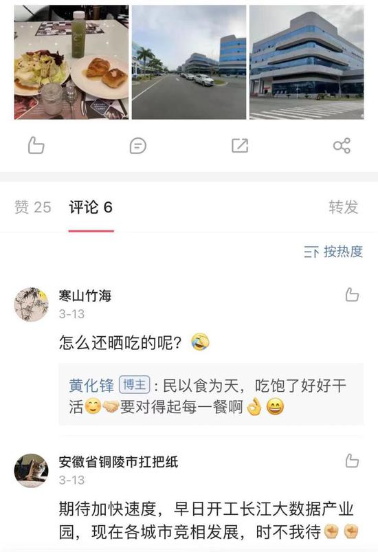值得关注的是,黄化锋会在在微博上用幽默的语气主动回应网友的评论,甚至面对网友指出的“错别字”,他也能虚心接受。例如在他3月13日发的一条考察平谦国际(广州)南沙产业园的大数据产业园的微博里配了一张在广州考察时在酒店吃自助餐的图片。有网友留言调侃“怎么还晒吃的呢?”,黄化锋回复称“民以食为天,吃饱了好好干活,要对得起每一餐啊。”