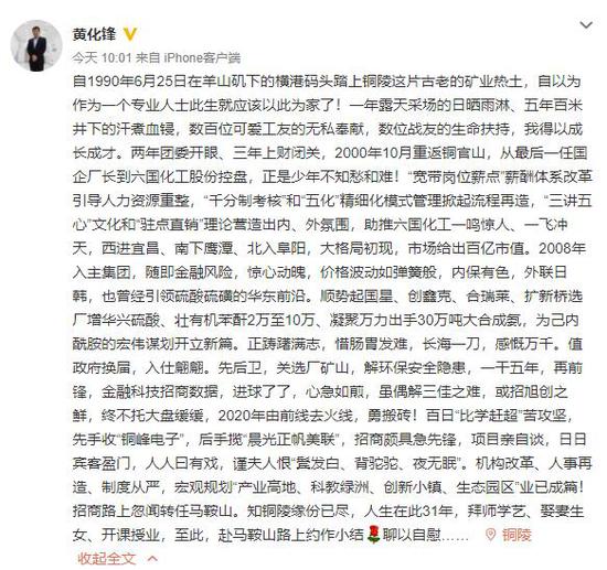 昨天(4月1日)上午,铜陵市委常委、铜陵经开区党工委书记黄化锋突然在其实名认证微博上发表离任感言,“招商路上忽闻转任马鞍山。知铜陵缘份已尽,人生在此31年,拜师学艺、娶妻生女、开课授业,至此,赴马鞍山路上约作小结,聊以自慰。”截至记者发稿时,他的这条微博下,共收到了168条网友留言,480条点赞。