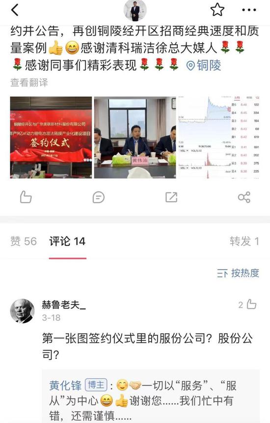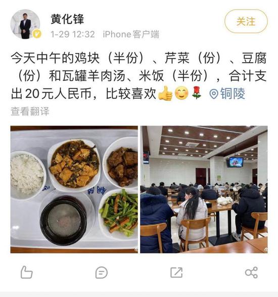 解放日报·上观新闻记者梳理发现,2021年以来,黄化锋共发了23条微博,内容主要包括三大类:一个是他在铜陵或外地考察、工作、学习的图文内容;一类是他的学习、阅读感受或者人生感悟;一类是他个人生活方面内容。总体来说,黄化锋的微博展示了较为鲜明的个人特色,在谈到招商时激情澎湃,在谈到生活时风趣活泼,非常接地气。比如他在1月29日专门发了一条微博,分享他当天中午在食堂吃的午餐,还幽默地评价“合计支出20元人民币,比较喜欢”。