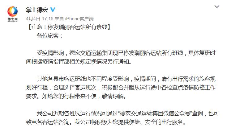 中新经纬客户端4月5日电 据德宏州委宣传部德宏网官方微博“掌上德宏”消息,受疫情影响,德宏交通运输集团现已停发瑞丽客运站所有班线,具体复班时间根据疫情指挥部相关规定视情况另行通知。