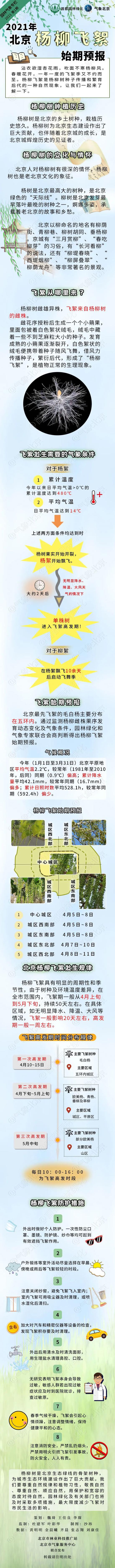 按照专家的预测,今年杨柳飞絮第一次高发期将出现在4月10日至15日,主要影响五环内城区,主要飞絮树种为毛白杨;第二次高发期4月下旬至5月上旬,区域为城区和平原区,主要飞絮树种为欧美杨、青杨、垂柳及旱柳;第三次高发期5月中旬,主要区域为山区,对城区无明显影响。