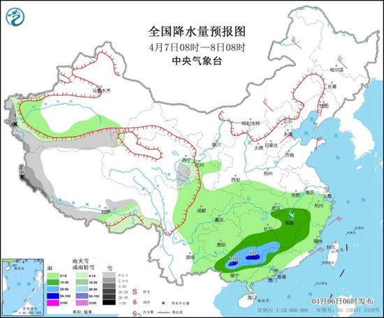 明天,江南中部和南部、华南北部和西部等地部分地区有中到大雨,其中,广西中部等地部分地区有暴雨或大暴雨。新疆南疆西部山区、西藏西部和南部、青海东部、甘肃南部等地部分地区有小雪或雨夹雪,其中,新疆南疆西部山区、西藏西部等地部分地区有中到大雪,局地暴雪。