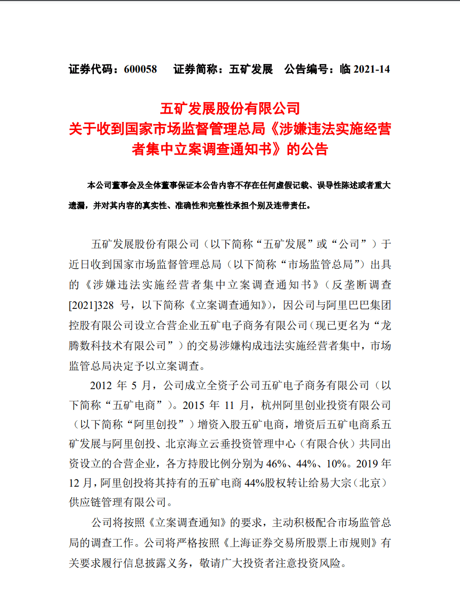 IT之家 4 月 19 日消息 今天晚间,五矿发展发布公告称,公司于近日收到市场监管总局出具的《涉嫌违法实施经营者集中立案调查通知书》,因公司与阿里巴巴集团控股有限公司设立合营企业五矿电子商务有限公司 (现已更名为“龙腾数科技术有限公司”) 的交易涉嫌构成违法实施经营者集中,市场监管总局决定予以立案调查。