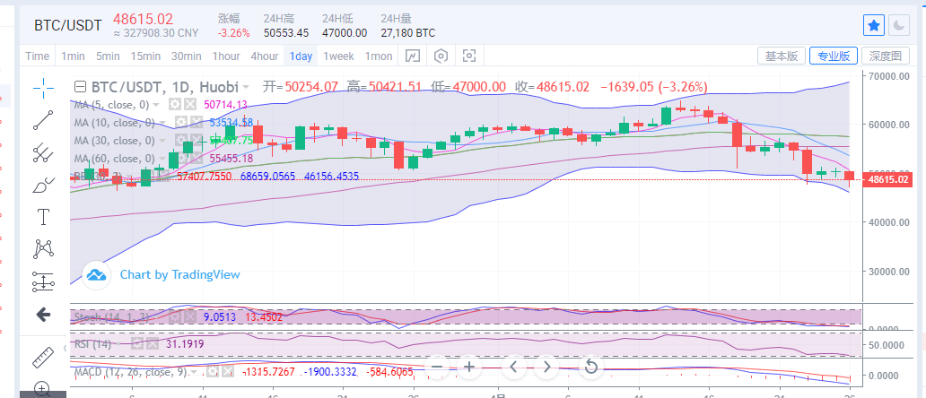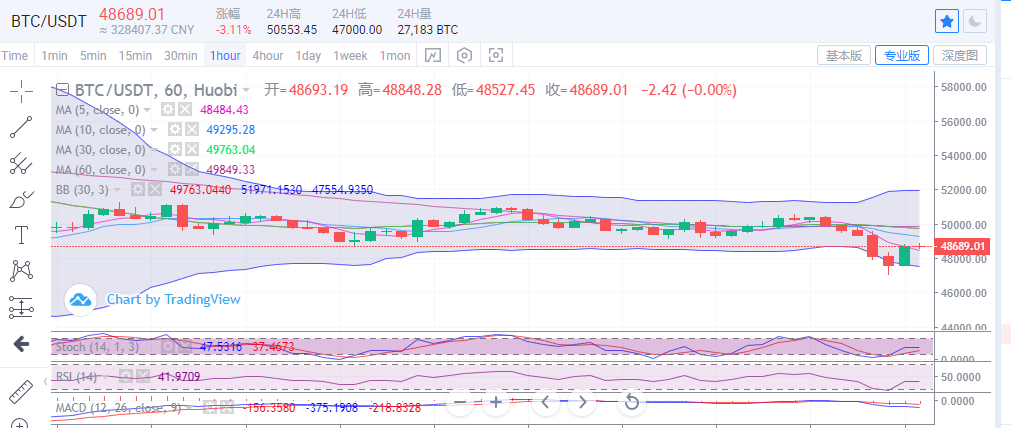 短周期小时图上上看,走势连续五连阴,虽然目前价格触47000一线走出强势反弹,价格也是重回48500位置附近运行,但是这波价格的连续下探,已经将布林带缺口打开,且行情在中下轨区域运行,后续若是反弹不能持续突破中规压制,行情还有进一步下行的风险。比特币目前进入震荡下行节奏,所以楚初建议稳健操作反弹空单为主,回调多单为辅,下行破位可以把握短线收益。上方压制关注49800,其次看51000一线。