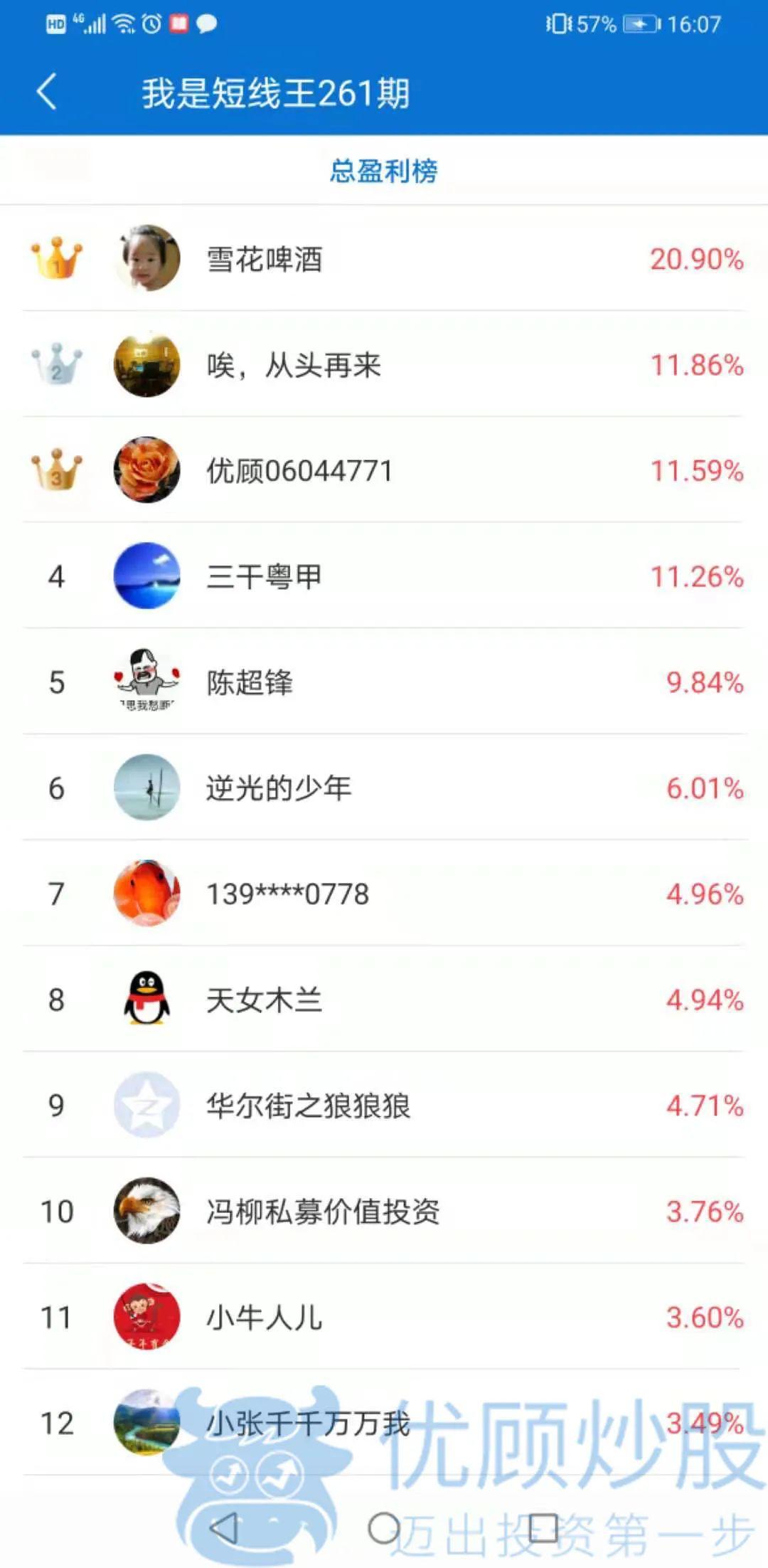 昵称为"雪花啤酒"的这名选手,以20.90%的总盈利获得了比赛冠军,该选手布局的五只股票中,涨幅最高的是4月20日入手的科顺股份,盈利186.62%;消息面上,受益于该公司今年一季度净利同比增463%的利好消息,该股在买入后持续拉升,成功打开上涨空间,该选手也依靠这只股票,在本次比赛中轻松夺魁,让我们祝贺他。
