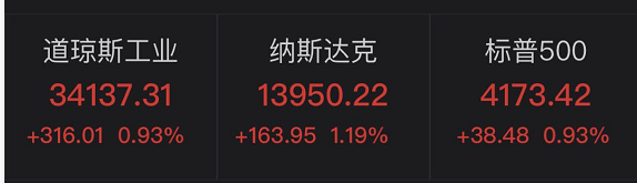 周三美国三大股指集体上涨。道指涨0.93%,标普500指数涨0.93%,纳指涨1.19%。