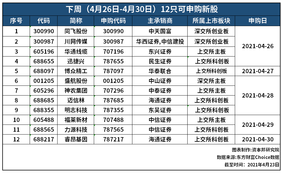 4月26日,资本邦了解到,本周(4月26日-4月30日)是“五一”节前最后的打新机会。根据数据显示,本周将有12只新股发行,包括科创板6只、沪市主板3只、创业板2只以及深市主板1只。