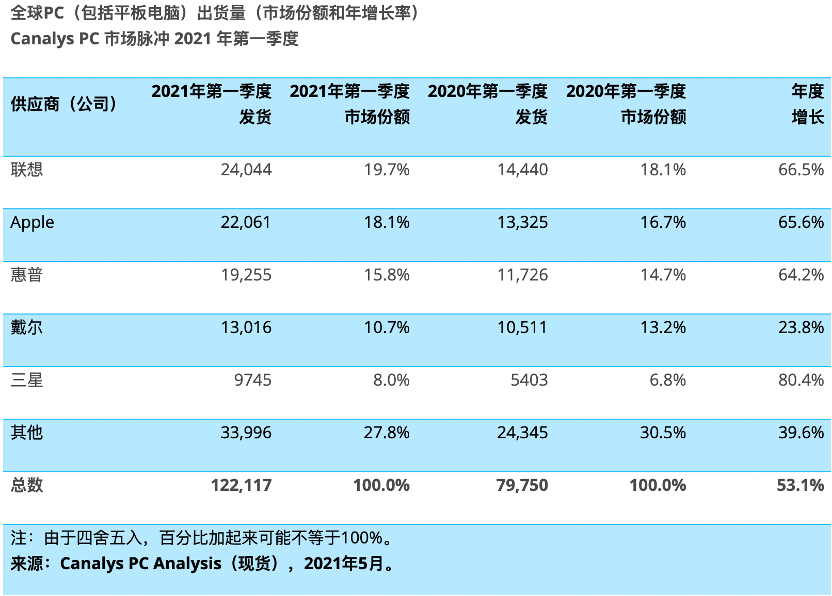 【环球网科技综合报道】5月5日消息,Canalys发布了关于个人电脑和平板电脑市场的季度报告,报告显示,2021年第一季度全球PC(包括台式机、笔记本和平板电脑)市场连续第四季度保持强劲增长,出货量同比增长53.1%,达到1.221亿台。