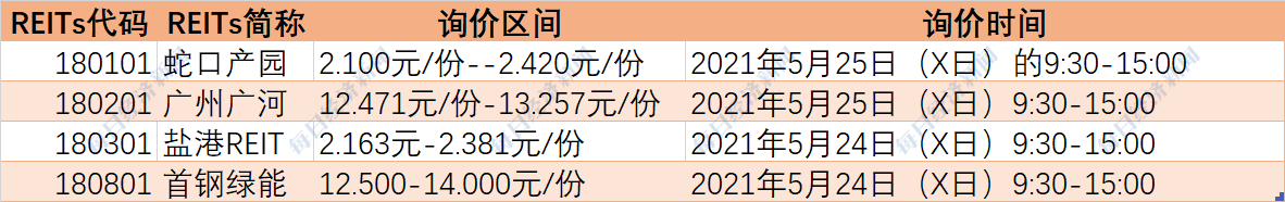 近日,深交所也陆续披露了首批4只公募REITs基金的相关公告,确定了询价时间以及发行时间等。记者注意到,4只基金的预计发售有所不同,首钢绿能的预计发售时间是5月28日,另外3只基金的预计发售时间是5月31日。