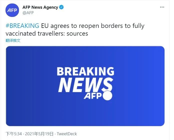 其实,欧盟重开边境的计划早有“苗头”,在本月6日,欧盟曾发布公告,建议成员国对来自澳大利亚、以色列、新西兰、卢旺达、新加坡、韩国及泰国7个国家的公民开放边境,对中国开放边境的附带条件是“确认对等”,即中国也对欧盟成员国公民开放边境。此外,欧盟还通报称,考虑到全球新冠疫苗接种进展,建议成员国对完成新冠疫苗接种的人员放宽入境旅行限制,允许至少在抵达前14天内接种新冠疫苗的人员入境欧盟。