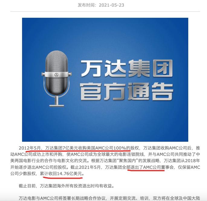中华网财经5月24日讯:大连万达集团股份有限公司于官网宣布,截止2021年5月,万达集团全部退出了AMC公司董事会,仅保留AMC公司少数股权,累计收回14.76亿美元。