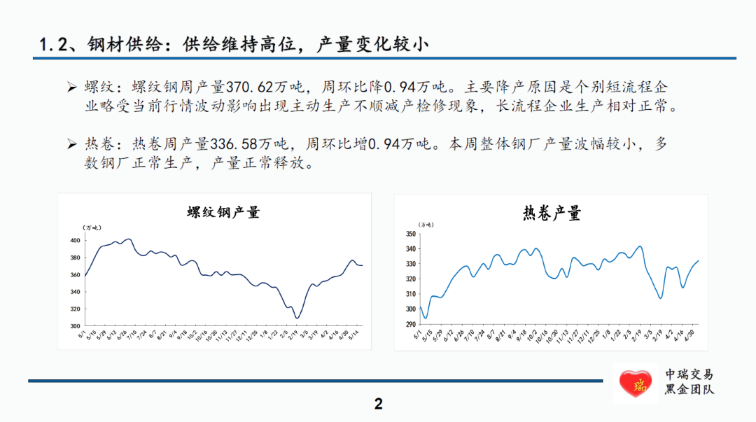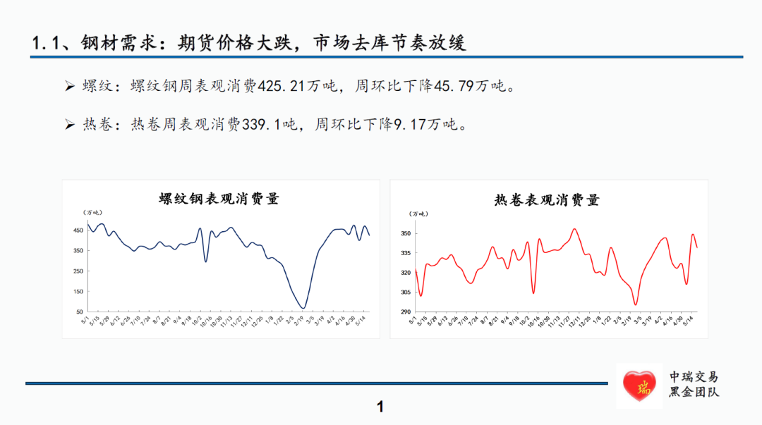 从近期市场来看,国家调控作用巨大,国常会给予黑色产业调控价格的信号,各部门约谈相关产业,市场纷纷响应,引发现货抛售,利空情绪蔓延。现货方面,上周供需高频数据继续走弱,与价格下跌相辅相成。周末方坯价格继续下调,反应周五晚盘大跌动作,同时随着南方即将进入梅雨季,传统淡季到来,卷螺需求将延续边际走弱,而压减粗钢产量正常迟迟未出台,对价格的支撑作用难以长时间持续。故即是近期盘面止跌,也不会出现继续拉涨的可能。