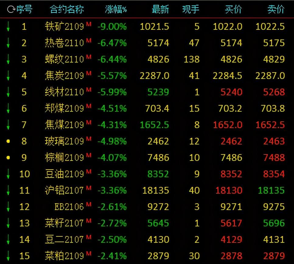 5月24日,黑色系早盘进一步下挫,铁矿石跌逾9%,热卷、螺纹跌6%。