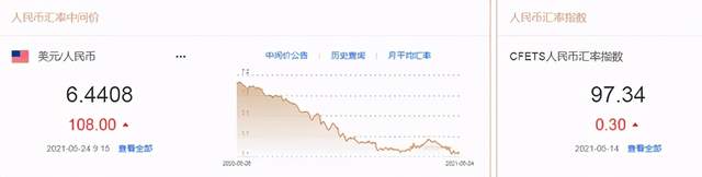 5月24日,人民币中间价报6.4408,下调108点,上一交易日中间价报6.4300,在岸人民币上一交易日收报6.4337。
