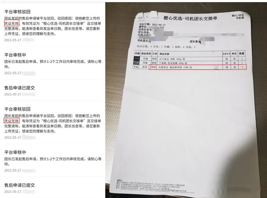 橙心优选被指退货流程繁琐,向用户索要“交接单”或是将团长、司机端的管理风险转嫁至消费者身上。