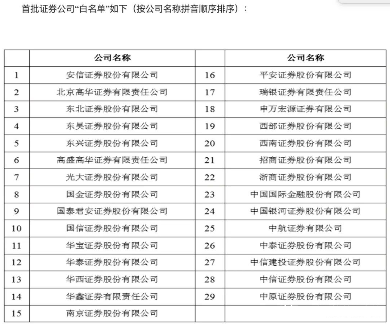 这一次披露的“白名单”中,29家券商分别为:安信证券、高华证券、东北证券、东吴证券、东兴证券、高盛高华证券、光大证券、国金证券、国泰君安、国信证券、华宝证券、华泰证券、华西证券、华鑫证券、南京证券、平安证券、瑞银证券、申万宏源证券、西部证券、西南证券、招商证券、浙商证券、中金公司、银河证券、中航证券、中泰证券、中信建投、中信证券、中原证券。