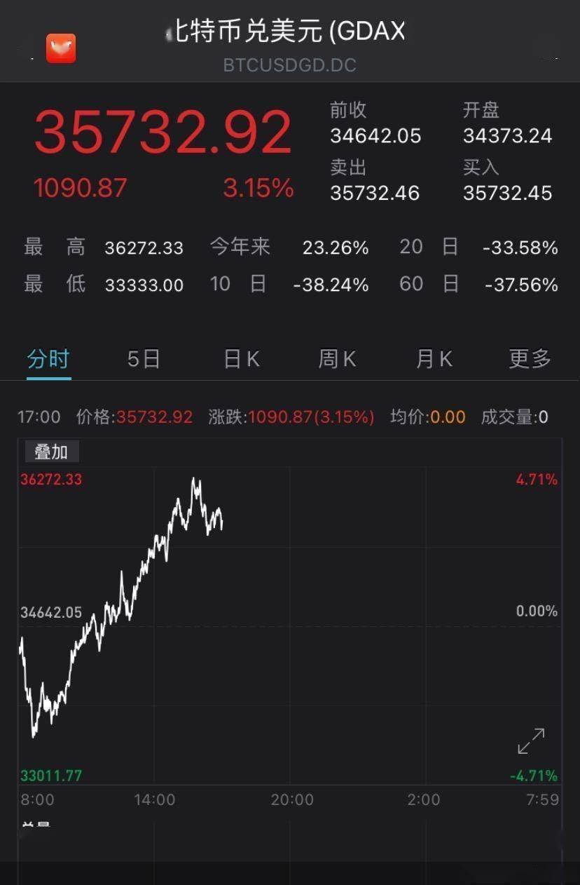 在历经5月30日早间半小时内下挫超1100美元后,比特币开始小幅回升,短暂突破36000美元关口后又有所回落。Wind数据显示,截至5月30日17时,比特币报35732.92美元,日内涨幅为3.5%。