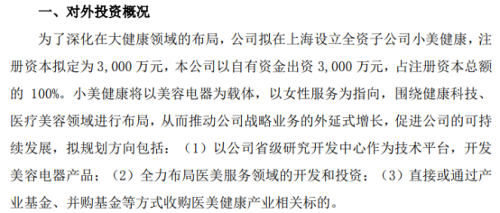 据了解,公司本次对外投资系看好医美市场的发展前景,其持续扩张将拉动医疗美容电器市场需求。公司拟依托自身在电子电器产品的自主研发及生产制造能力,着力研究开发相关产品,从而进一步深化公司在大健康领域布局的广度和深度。同时,公司拟通过引入具备医美行业经营管理经验的团队、机构,逐步涉入医美服务领域业务,最终以“产品+服务”打造医美健康新品牌,以持续提升公司盈利能力,促进公司未来持续稳健发展。