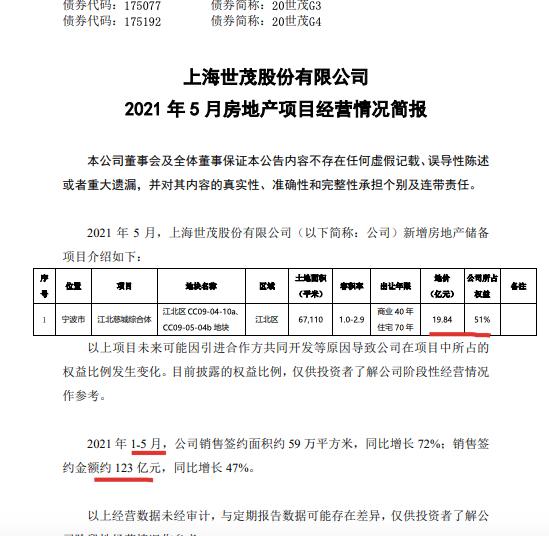 中华网财经此前报道,2021年1-4月,世茂股份销售签约面积约37万平方米;销售签约金额约75亿元。由此计算,5月单月,公司销售签约面积约22万平方米,销售签约金额约48亿元。
