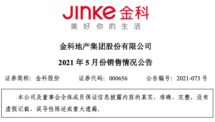 2021年1-4月份,金科集团及所投资的公司实现销售金额约653亿元,房地产销售面积约623万平方米,平均销售价为10482元/平米。