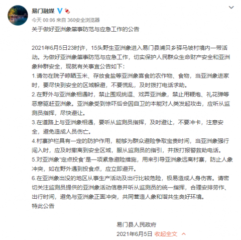 为做好亚洲象肇事防范与应急工作,切实保护人民群众生命财产安全和亚洲象种群安全,现就有关事宜公告如下: