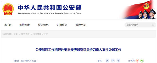 公安部网站消息,6月5日16时27分许,安徽省安庆市迎江区人民路商业步行街发生持刀伤人案件。接报后,公安部高度重视,要求安徽公安机关全力侦办案件,切实维护社会安全稳定,并连夜派出工作组,赶赴当地督察指导案件处置工作。