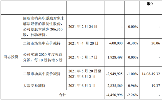 公告显示,减持前尚志投资合计持有公司股份4,456,996股,本次减持后不持有公司股份。