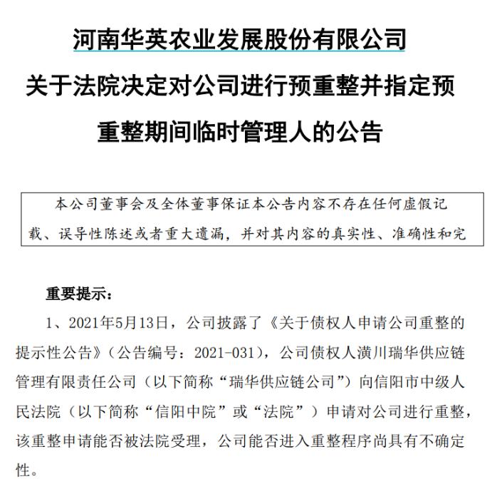【大河报·大河财立方】(记者 王磊彬)6月6日,河南华英农业发展股份有限公司(以下简称华英农业或*ST华英)发布公告称,信阳市中级人民法院(以下简称信阳中院)决定对公司进行预重整。