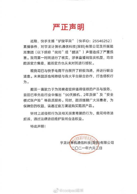 6月2日,酷派集团发布关于快手主播“驴嫂平荣”直播事件的声明:该直播事件,对酷派声誉造成了严重损害,公司第一时间进行了核实,涉事直播间售卖机型,均非酷派官方售卖,酷派也从未对其进行授权。酷派将依法起诉,维护公司合法权益。