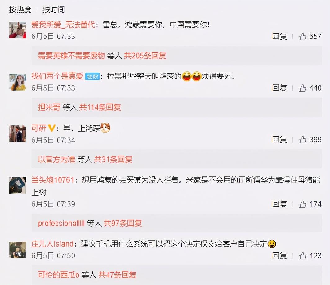 只要雷军敢发布微博,热评前几条,至少有一条这样的评论“小米什么时候适配鸿蒙?”