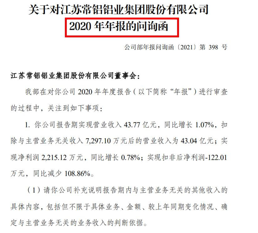 6月11日,深交所向江苏常铝铝业集团股份有限公司(常铝股份)发出年报问询函,由于常铝股份2020年扣非净利润润为-122.01 万元,同比跌108.86%。深交所提出了包括要求说明扣非净利大跌的原因,以及说明各类业务是否存在与公司正常经营业务无直接关系、偶发性等13问题。